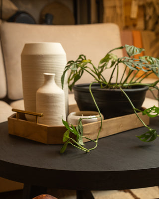 Solid polished wood tray with hexagonal profile and golden metal handles. Ideal for decorating environments or serving on tables or beds.
