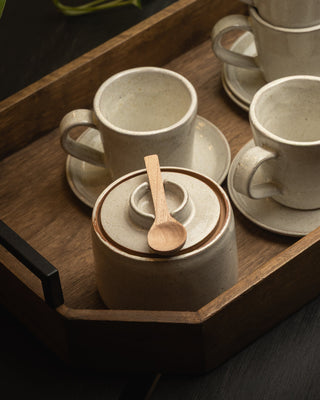 El azucarero de cerámica artesanal forma parte de nuestra colección de vajillas Arena, con una cuchara de madera que aporte un detalle que une calidez y practicidad. Perfecto para endulzar tus momentos cotidianos, se integra armónicamente con nuestra colección de tazas y platos, aportando naturalidad y elegancia a la mesa.