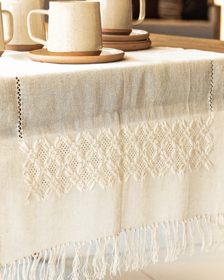 Sobre el producto: Caminero de lienzo de algodón con bordado de puntos de ao po'i y vainillas en los extremos, hechos a mano.