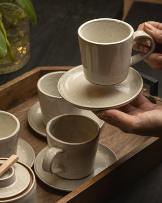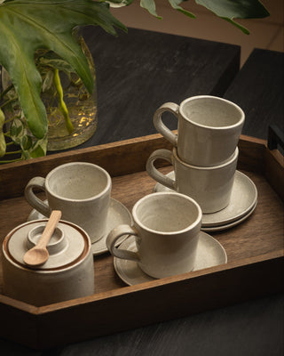 Nuestro set de tazas Lungo Arena consta de 4 tazas y 4 platitos de cerámica esmaltada acabado brilloso y base natural que combina diseño y calidez en una pieza de cerámica artesanal pensada para acompañarte en ese momento especial del día. Hecha a mano con arcillas y esmaltes no tóxicos, aptos para consumo de alimentos. Cada pieza es única y lleva consigo el encanto de lo auténtico.